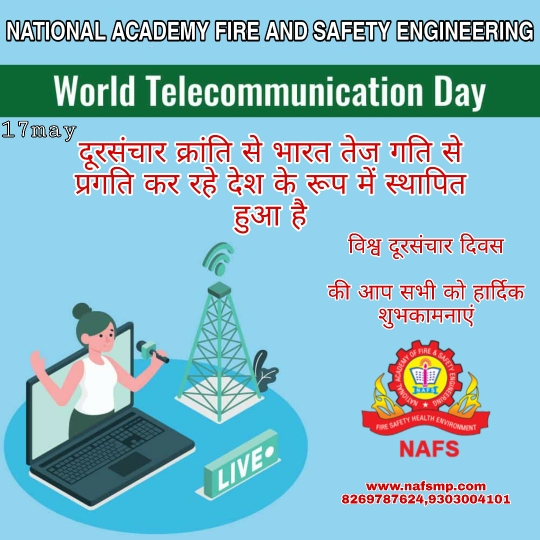 17 May World Telecommunication Day दूरसंचार क्रांति से भारत तेज गति से प्रगति कर रहे देश के रूप में स्थापित हुआ है विश्व दूरसंचार दिवस की आप सभी को हार्दिक शुभकामनाएं WWW.NAFSMP.COM 8269787624 , 9303004101 अग्नि सुरक्षा एवं आपदा प्रबंधन संस्थान*l NAFS- NATIONAL ACADEMY OF FIRE AND SAFETY ENGINEERING (M.P.) National Awarded Organization COURSE - DIPLOMA । PG DIPLOMA । B.TECH । MBA BRANCHES GWALIOR । BHOPAL । BETUL Website - WWW.NAFSMP.COM Call us - 8269787624 , 9303004101
